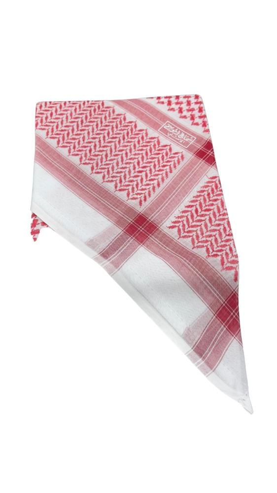 يتميز الشماغ بنقشة "السهم والدانة" التقليدية المحببة في الثقافة الخليجية، حيث تم رسمها بدقة شديدة بخيوط حمراء بارزة على خلفية بيضاء نقية. هذه النقوش تضفي طابعًا رجوليًا قويًا وتجعله مناسبًا للرسميات والمناسبات الوطنية والعائلية.