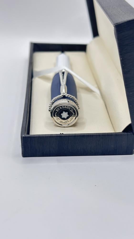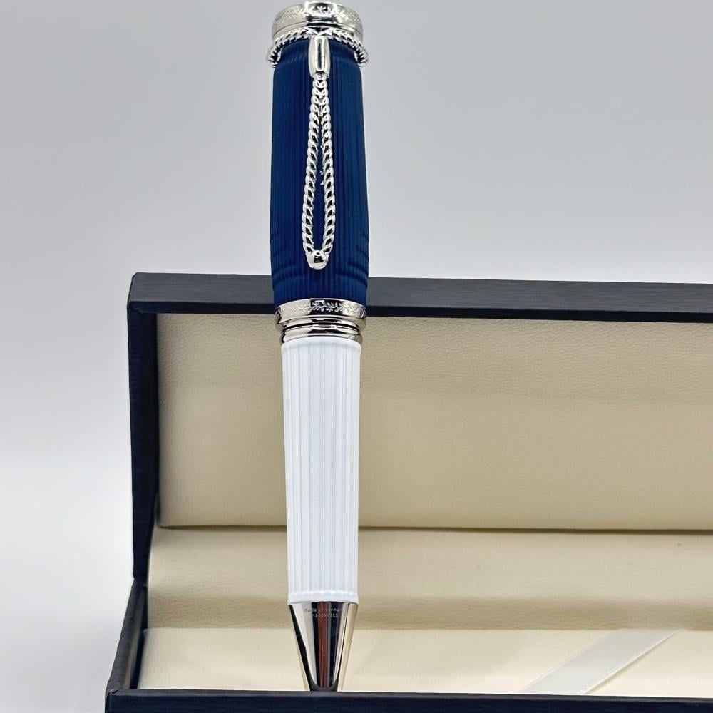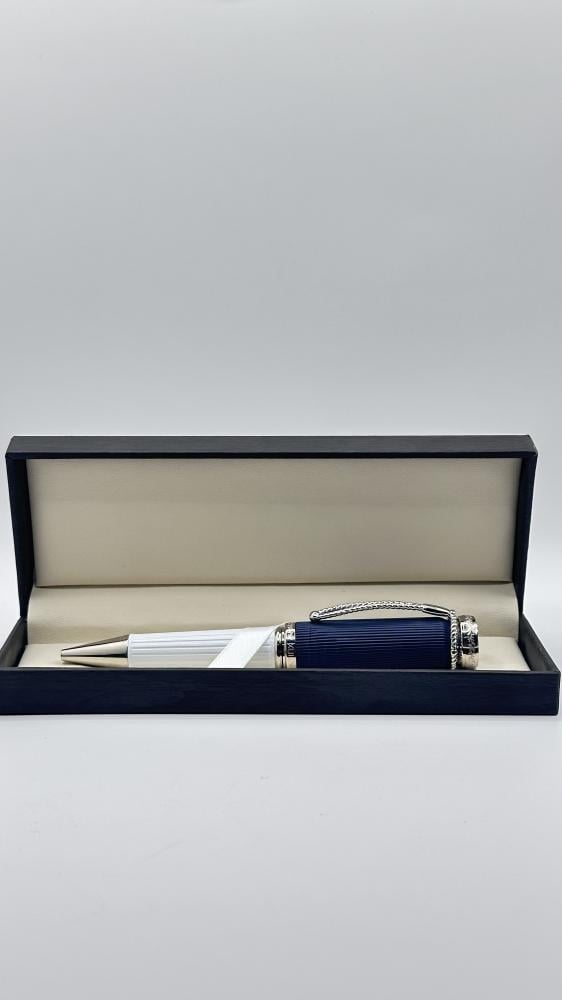 يعكس القلم مزيجًا راقيًا بين اللون الأزرق الملكي الغني في غطائه العلوي واللون الأبيض العاجي المصقول في جسمه السفلي. يكتمل المشهد بأناقة التفاصيل المعدنية المطلية بالبلاتين أو الفضة، والتي تضفي عليه هالة من الرقي الخالد.