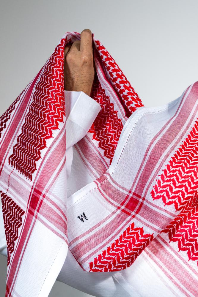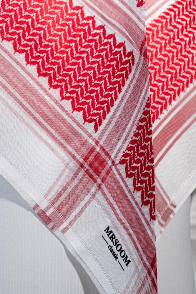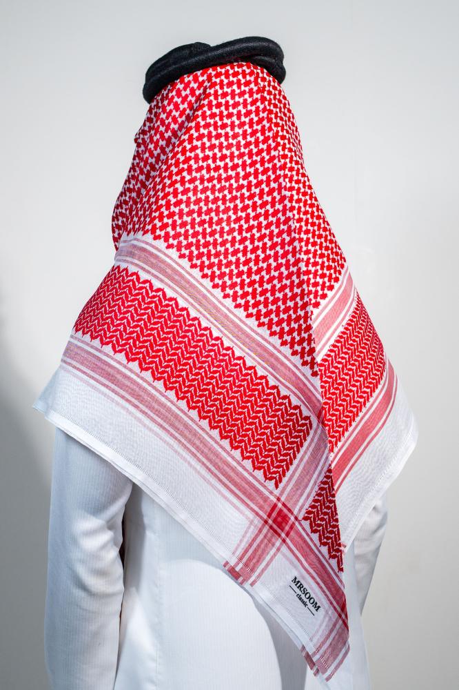 شماغ مرسوم دم الغزال يتميز بلونه الفريد الأقرب للون الدم الطبيعي، مع نقش كلاسيكي متناسق، وخامة أكثر نعومة وثباتًا، بالإضافة إلى توقيع "مرسوم" المميز.