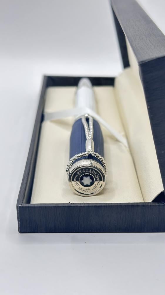 يأتي الغطاء بلون أزرق ملكي عميق مع لمسات فضية مذهلة، مزدان بمشبك مميز يتدلّى كقلادة أنيقة، تضيف لمسة من الرقي الملكي على التصميم. أما جسم القلم، فهو مصنوع من الريزين الأبيض الفاخر المزخرف بخطوط عمودية أنيقة ونقش يحمل توقيع “Montblanc”، في تعبير عن الذوق الرفيع والاهتمام بأدق التفاصيل.